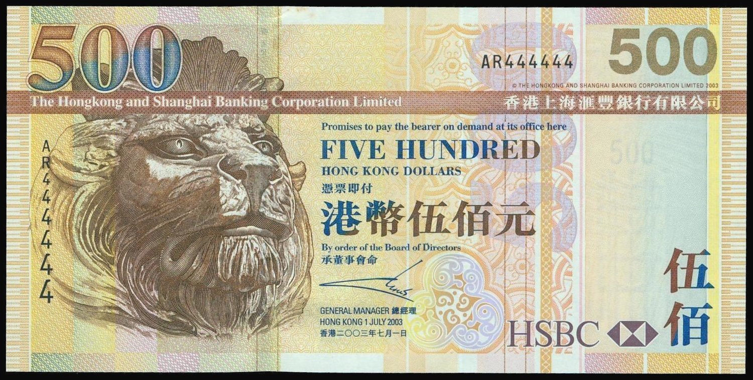 The HongKong and Shanghai Banking Corporation, $500, 2003, lucky serial number AR444444, (Pick 210), uncirculated, the top border has a small area of toning