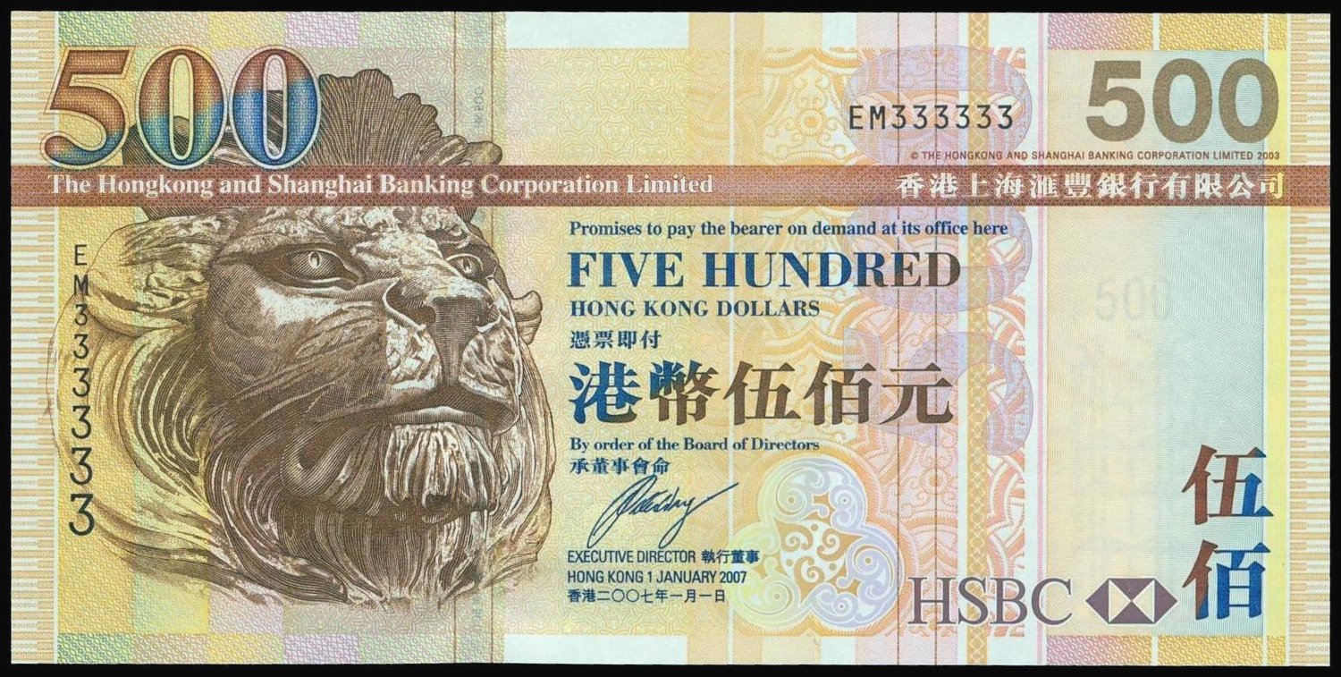 The HongKong and Shanghai Banking Corporation, $500, 2007, lucky serial number EM333333, (Pick 201), uncirculated