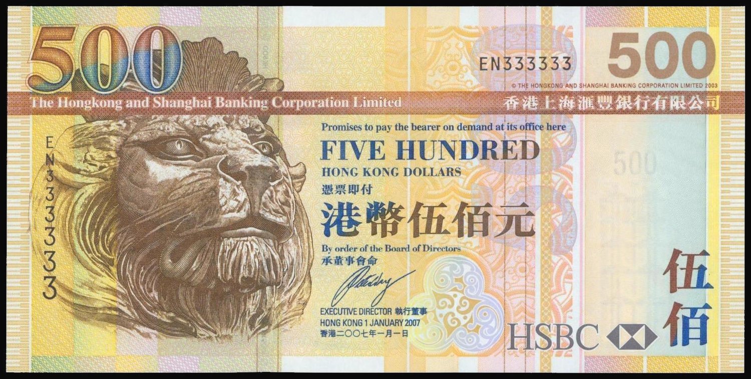 The HongKong and Shanghai Banking Corporation, $500, 2007, lucky serial number EN333333, brown and multicoloured, lion at left, reverse brown, Chek Lap Kok airport,
