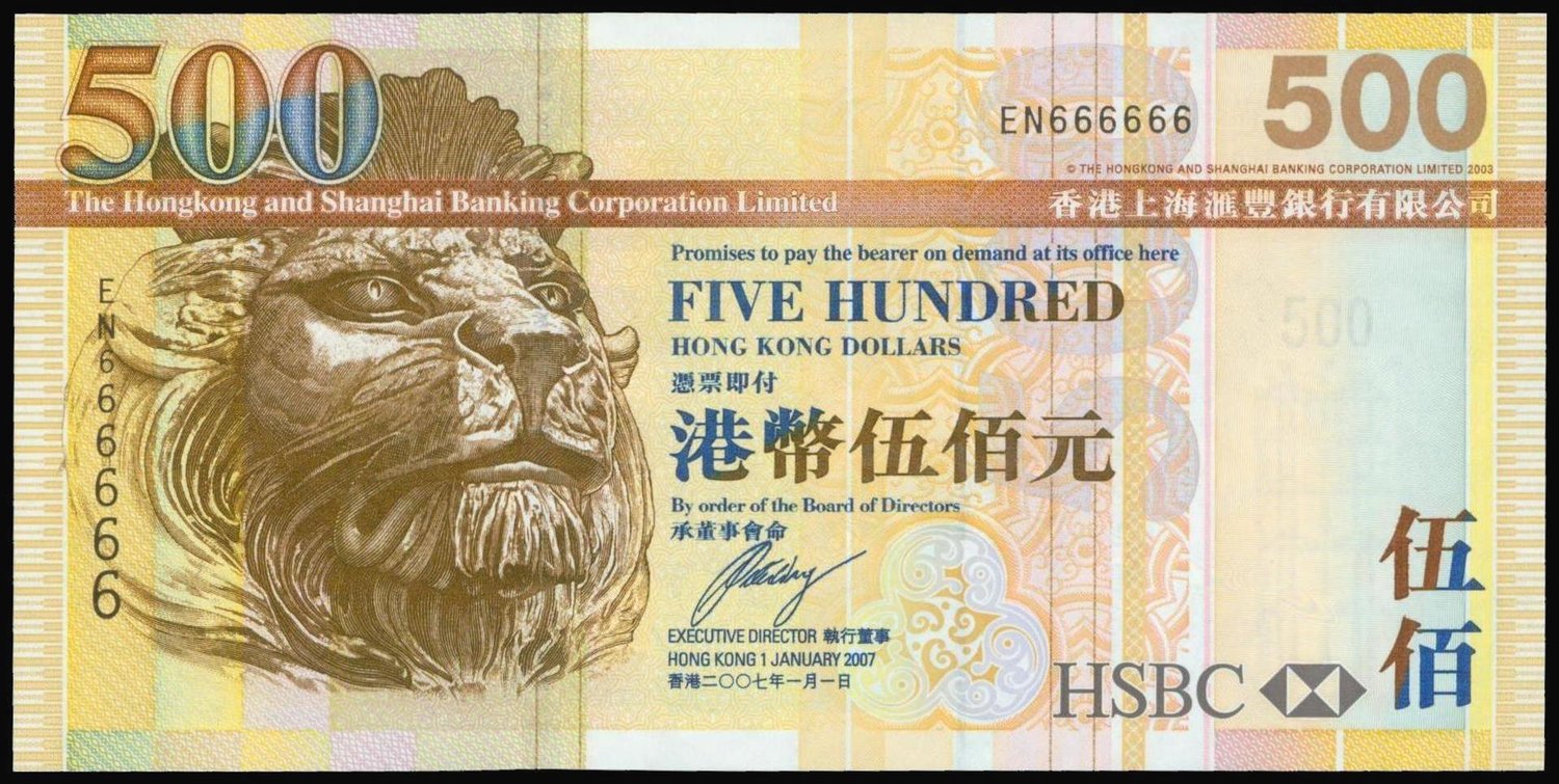 The HongKong and Shanghai Banking Corporation, $500, 2007, lucky serial number EN666666, brown and multicoloured, lion at left, reverse brown, Chek Lap Kok airport,