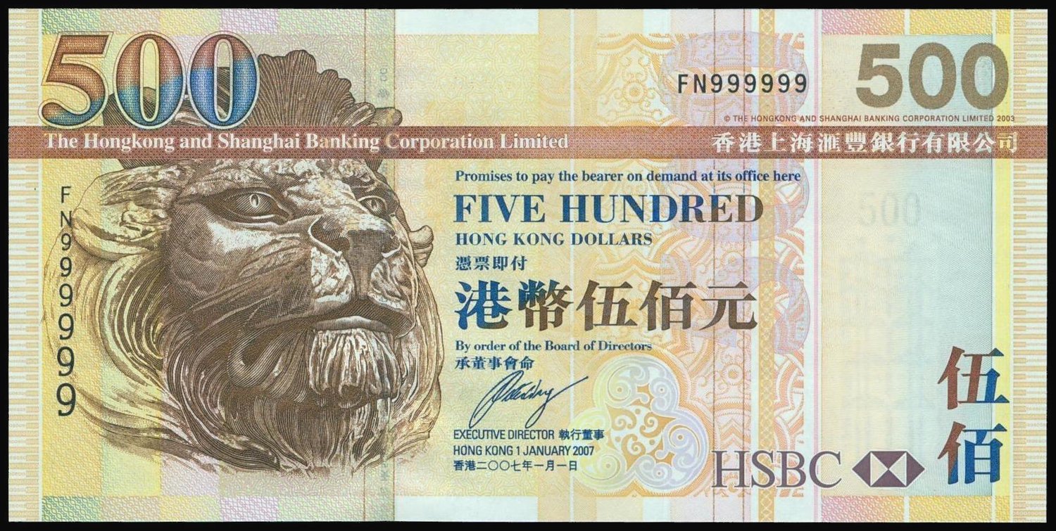 The HongKong and Shanghai Banking Corporation, $500, 2007, lucky serial number FN999999. (Pick 210), uncirculated