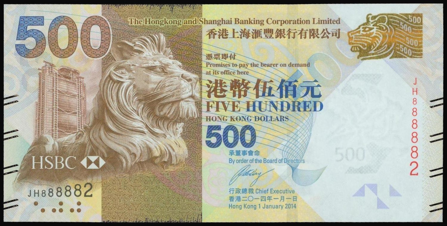 Hong Kong and Shanghai Banking Corporation,$500, 2014, serial number JH888882,brown on multicolour underprint, lion and bank building at left, reverse brown and light green, scene of Lunar New Year at right,