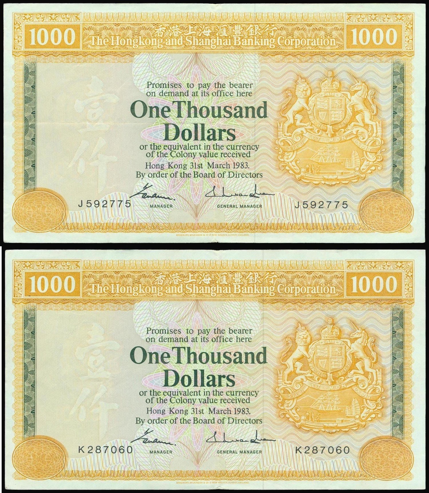 The HongKong and Shanghai Banking Corporation, lot of 2x $1000, both dated 1983, serial numbers J592775 and K287060, yellow on multicoloured, Royal crest at right, 'One Thousand' in Chinese characters underprinted at right, reverse yellow and grey, howling lion at left,