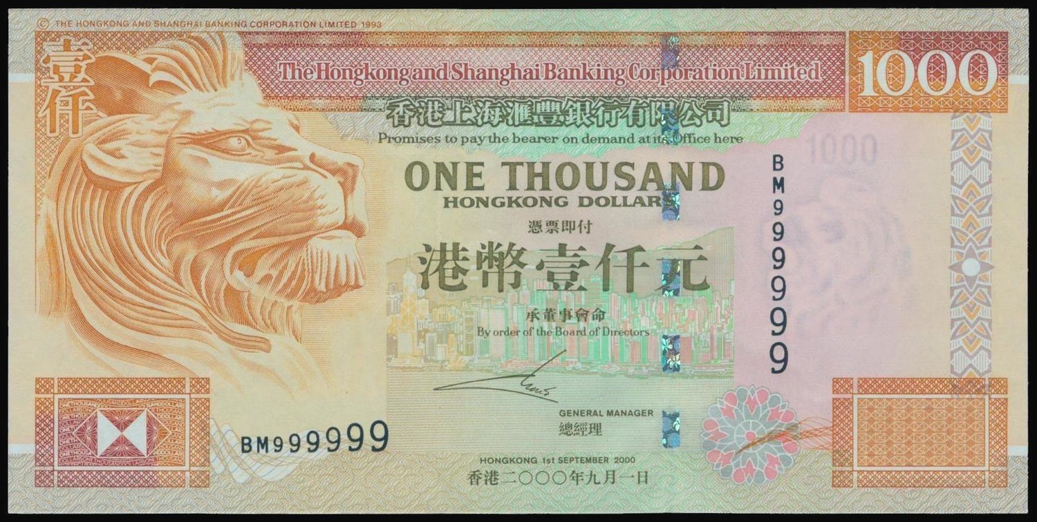 The HongKong and Shanghai Banking Corporation, $1000, 2000, lucky serial number BM999999, orange, green and multicolour, profile of a lion at left, city skyline at centre, watermark at right,