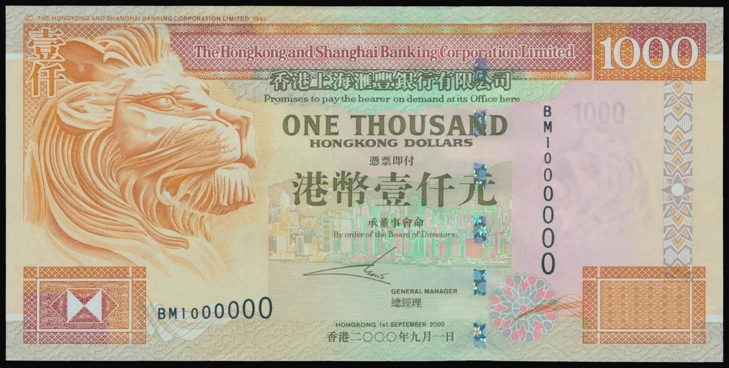 The HongKong and Shanghai Banking Corporation, $1000, 2000, lucky serial number BM1000000, orange, green and multicolour, profile of a lion at left, city skyline at centre, watermark at right,