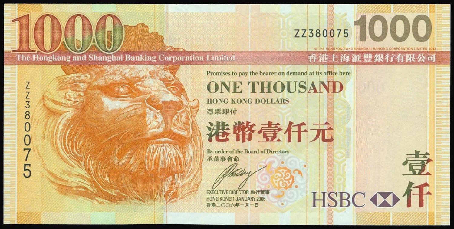 The HongKong and Shanghai Banking Corporation, $1000, 2006, replacement prefix ZZ380075, (Pick 211), uncirculated with minor handling marks