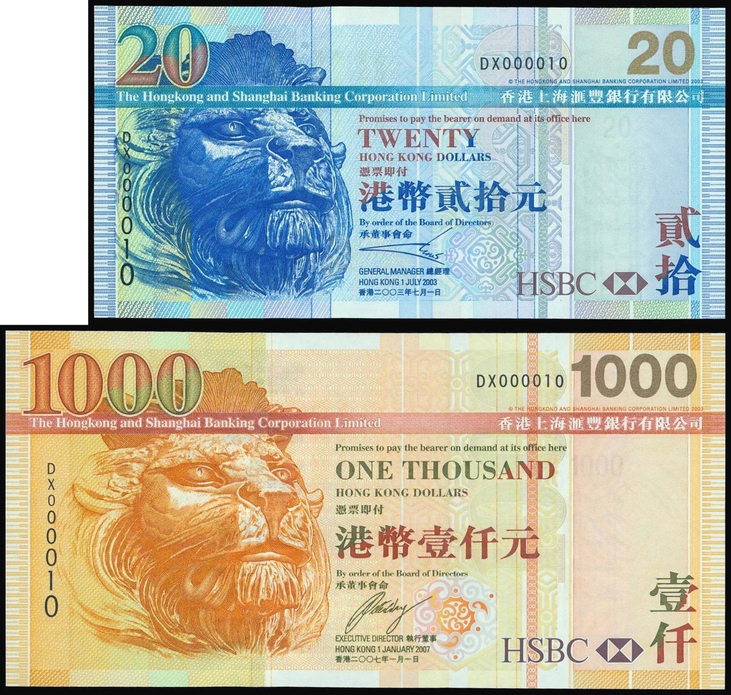 The HongKong and Shanghai Banking Corporation, lot of $20 and $1000, 2003 and 2007, identical low serial number DX000010, (Pick 207 and 211), uncirculated (2)