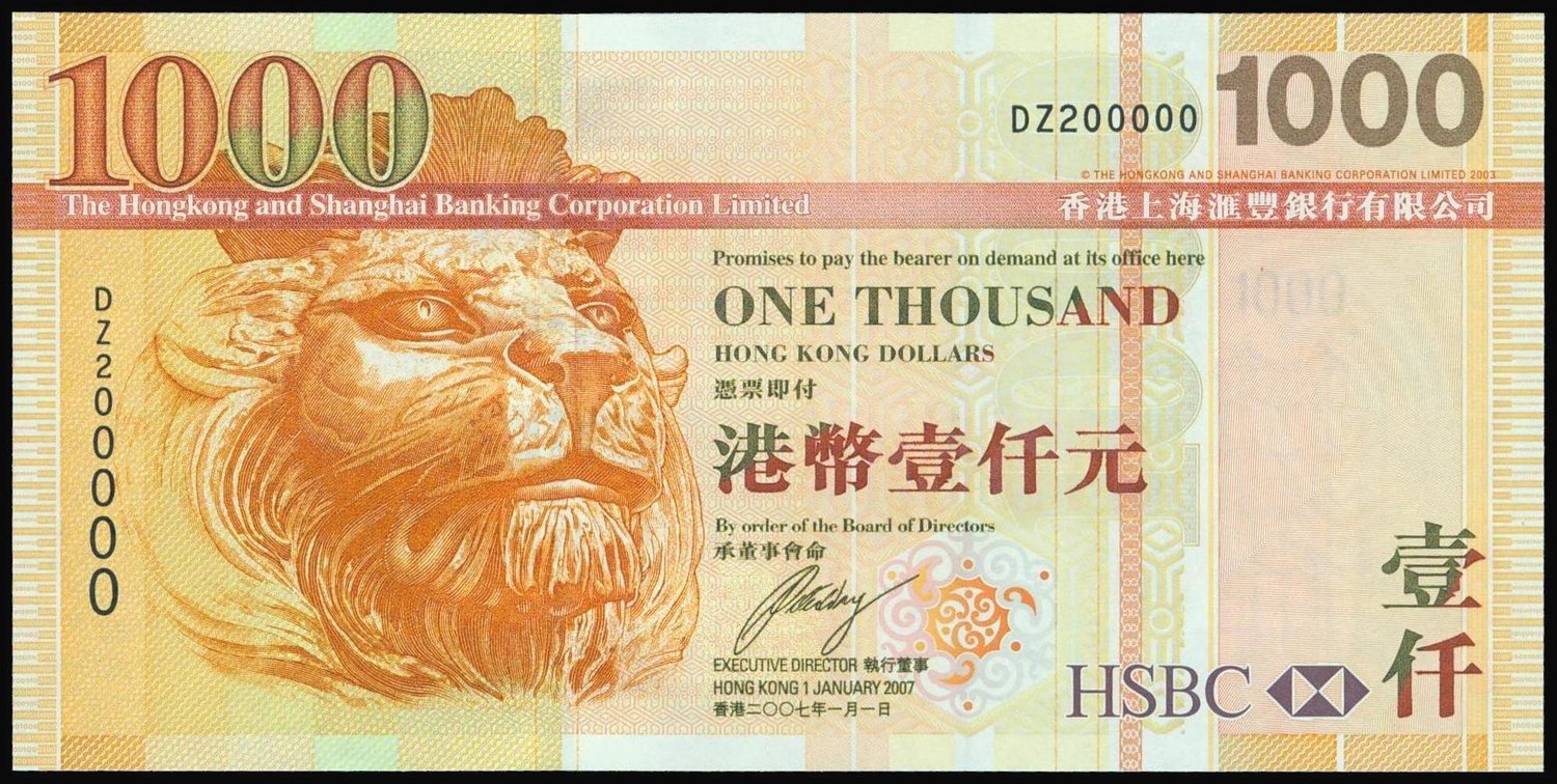 The HongKong and Shanghai Banking Corporation, $1000, 2007, semi lucky serial number DZ200000, (Pick 211), uncirculated