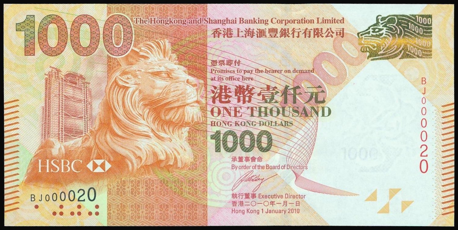 The HongKong and Shanghai Banking Corporation, $1000, 2010, low serial number BJ000020, uncirculated