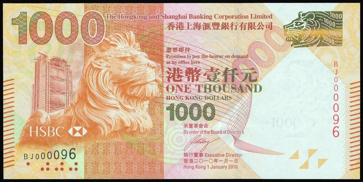 The HongKong and Shanghai Banking Corporation, $1000, 2010, low serial number BJ000096, uncirculated