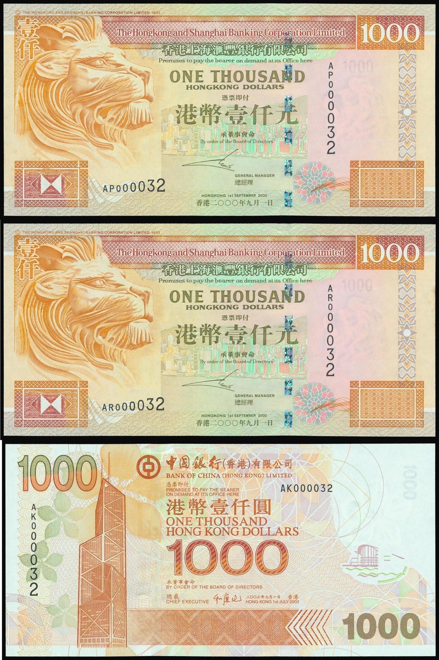 Hong Kong, lot of 3x $1000, HSBC and Bank of China, all with the same serial number 000032, (Pick 206 and 339), uncirculated (3)