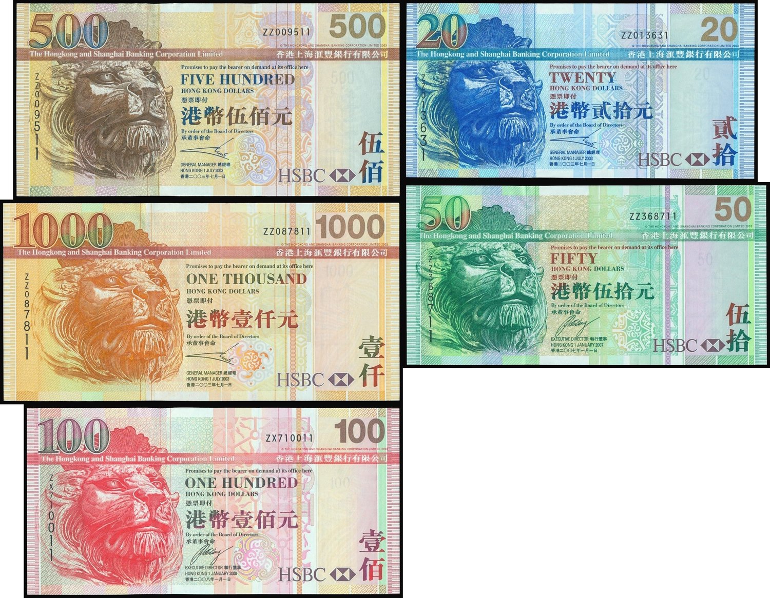 The HongKong and Shanghai Banking Corporation, set of replacement prefixes, ZX and ZZ $20, $50, $100, $500 and $1000, 2003 to 2008,