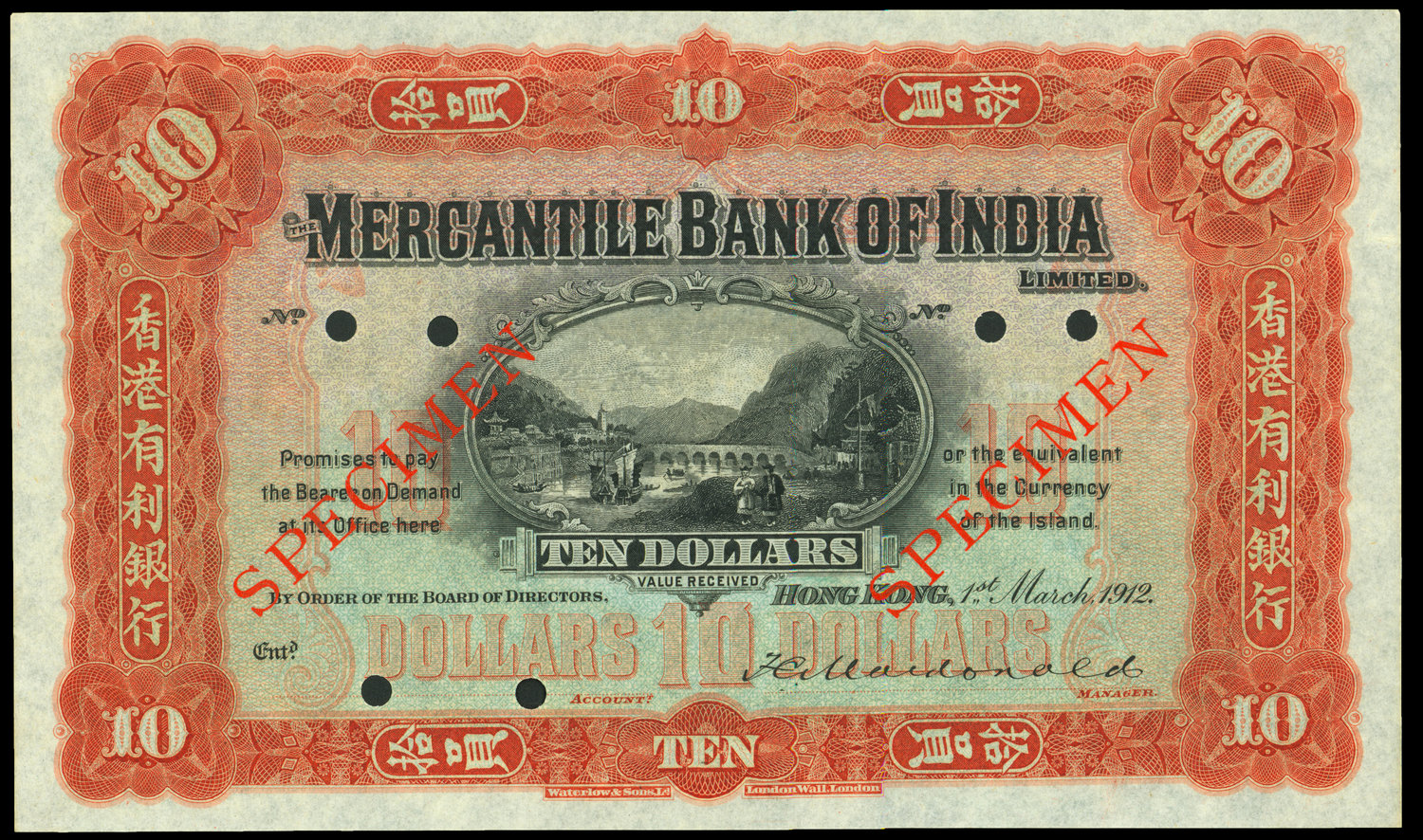 Mercantile Bank of India, $10, specimen, 1912, without serial numbers, red, black and multicolour, houses and mountains by lakeside at centre, reverse green and black, Mercury at centre,
