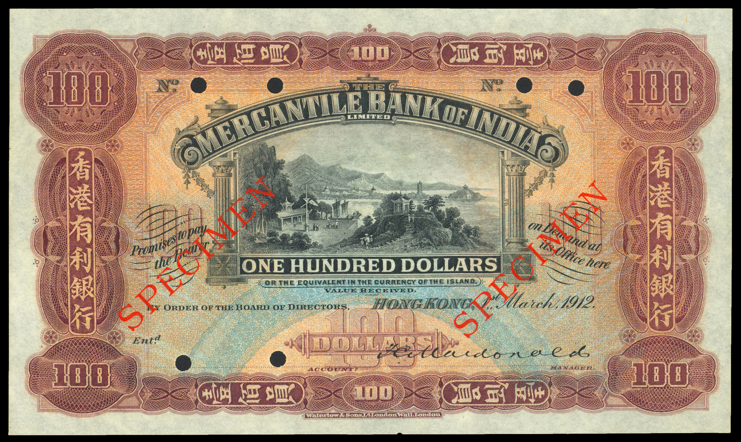 Mercantile Bank of India, $100, specimen, 1912, without serial numbers, dark red, orange and multicolour, Chinese houses and peasants at centre, reverse orange and black, head of Mercury at centre, signed by Macdonald,