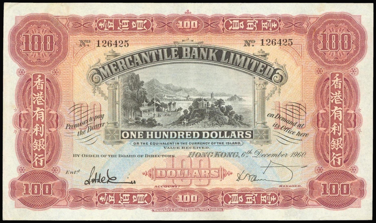Mercantile Bank Limited, $100, 6.12.1960, serial number 126425, black and blue on red, houses by water's edge at centre, reverse red and black, Mercury at centre,