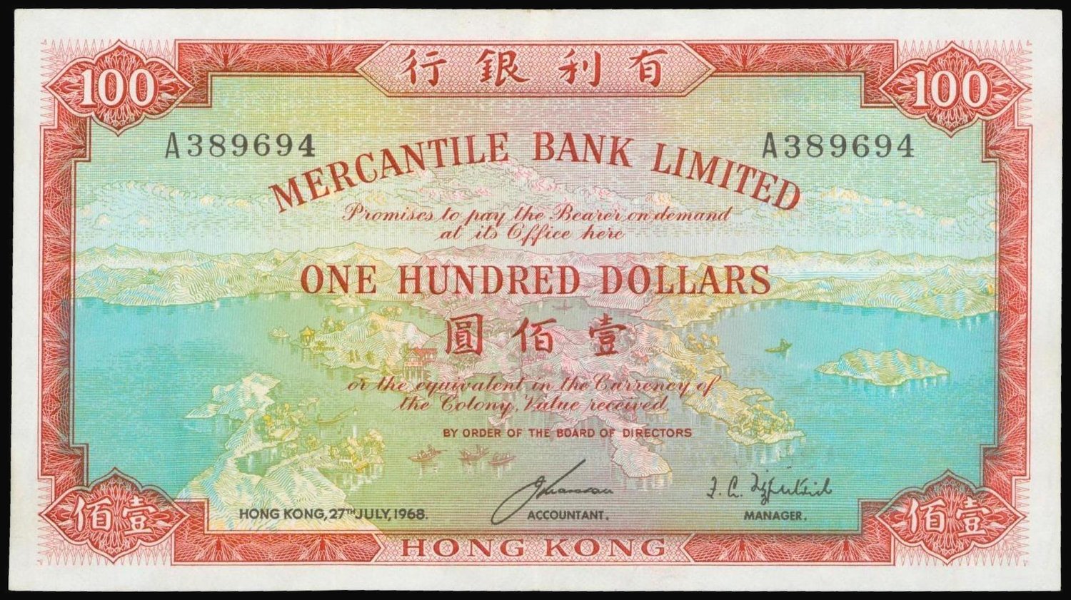 Mercantile Bank Limited,$100, 27 July 1968, serial number A389694,red on light blue and green, view of early Hong Kong in field, reverse red, Britainnia at centre,