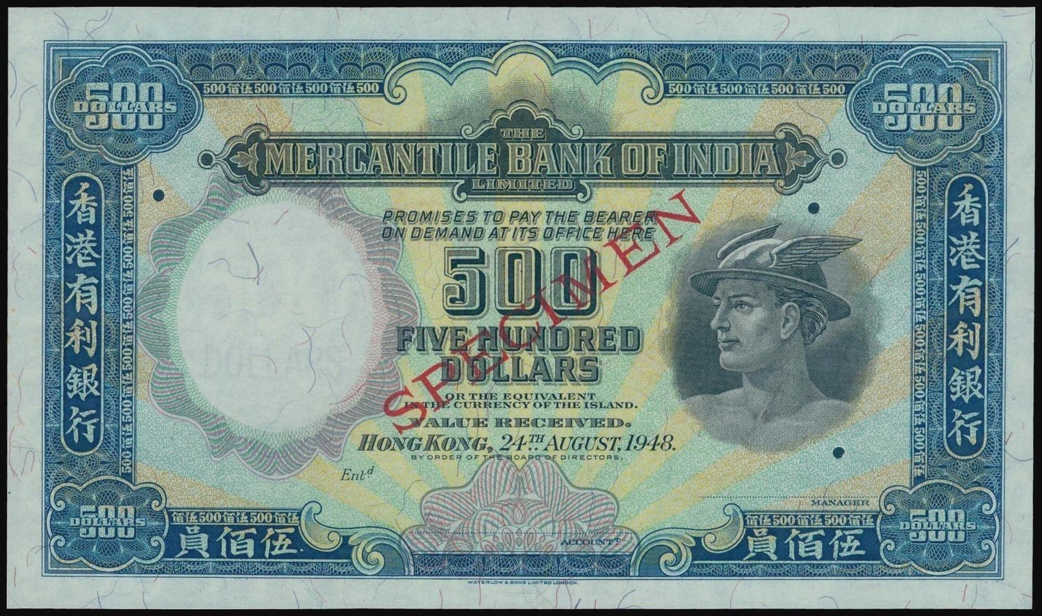 Mercantile Bank of India, $500, specimen, 1948, without serial numbers, blue, black and multicolour, Mercury with winged helmet at right, watermakr area at left, reverse blue, depicting the pai fang in Confucius's Cemetery,