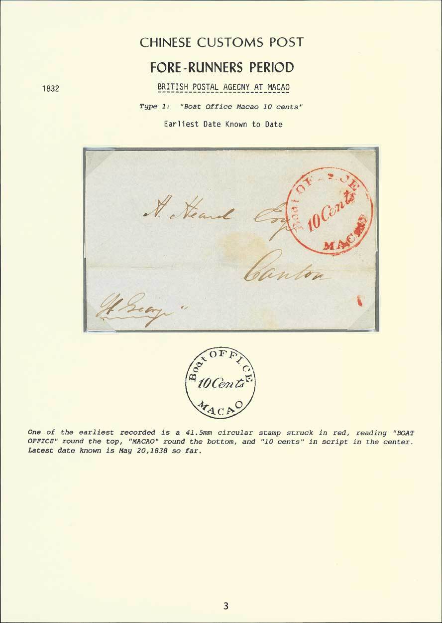 1832 (11 July) entire letter to Augustine Heard in Canton bearing a fine strike of the "Boat office/macao/10 Cents" handstamp in a deep shade of scarlet, well struck on the address side and carried on the "St George". With the original letter from Macau, from the wife of his agent, who could not write himself as he had been taken ill on the passage over. The wrapper with two brush stoke delivery characters on the reverse.