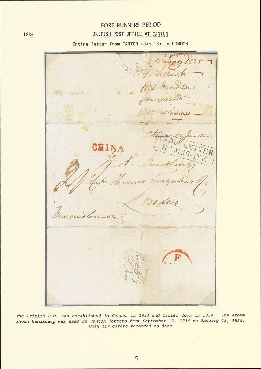 1835 (13 Jan.) an entire letter bearing "China 13. Jan 1835" to London from Canton and carried on the "Marquis Camden"; bears a neat strike of the boxed "india letter/ramsgate" and a superb strike of the straight-line "CHINA" in red with London arrival struck over the flaps (11.5), with "2/2" rate mark in ink; light vertical filing crease.