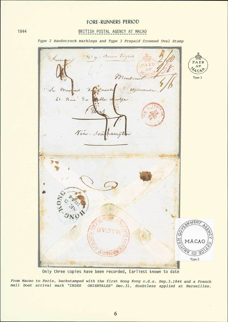 1844 (Sept.) opened-out envelope to Paris "Viá Southampton" bearing fine strikes of both of the rare "paid/at/macao" Crowned Circle and, on the reverse, "british government agency office/macao" double-circle, both in red, the reverse with Hong Kong (3.9) and faint Paris (3.1) c.d.s.