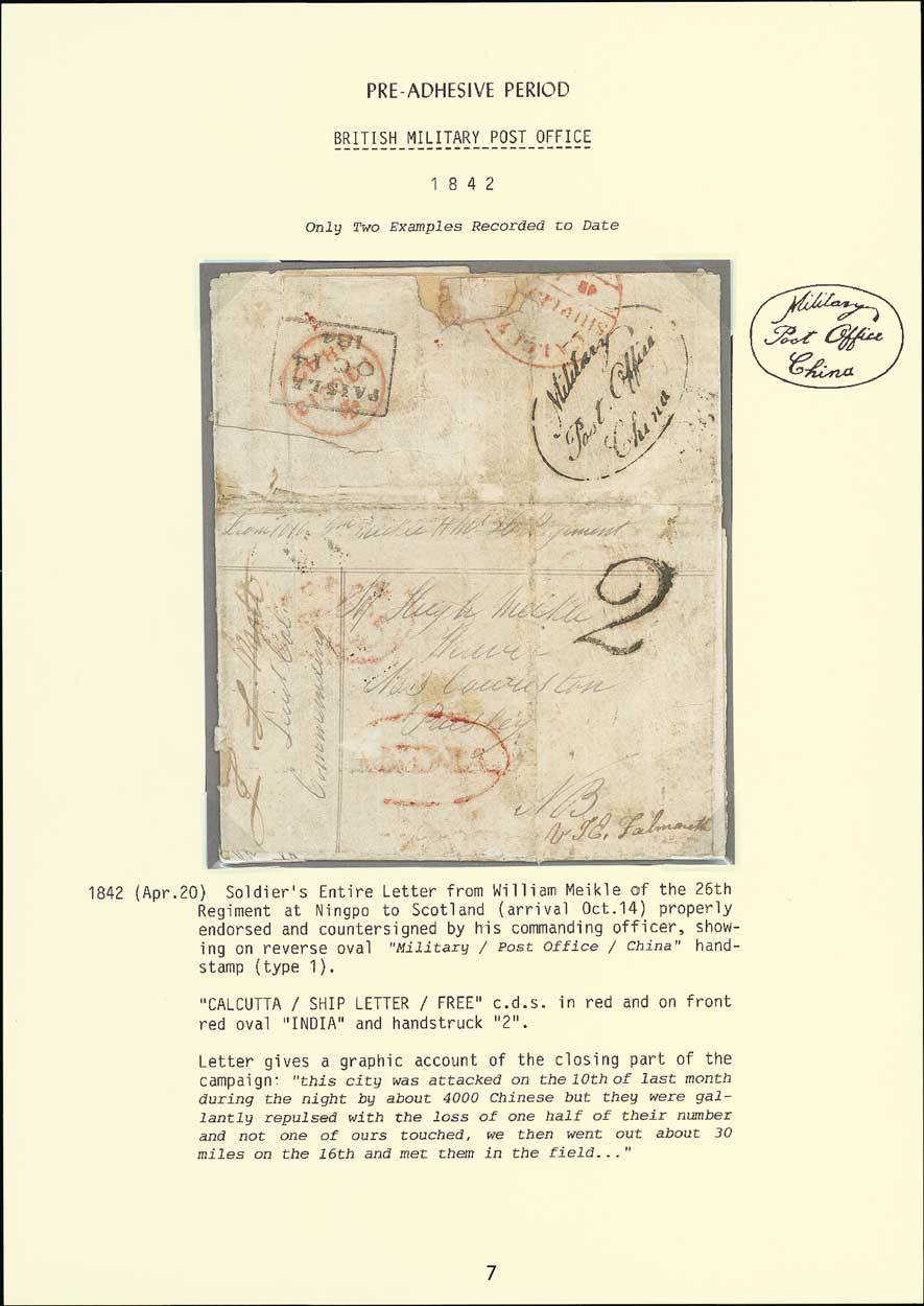 1842 (20 Apr.) entire soldier's letter from Ningpo to Scotland, from William Meikle of the 26th Regiment and correctly countersigned by his commanding officer, Lieut Col. Mott. The flap bears a very fine strike of the oval "Military/Post Office/China" handstamp in cursive script in black, and which opens out well for display. Other postal markings are "calcutta/ship letter/free" c.d.s. in red, "india" in oval, London transit (13.10) overstruck by Paisley arrival the following day and the front bears a handstruck "2" in black for postage due.