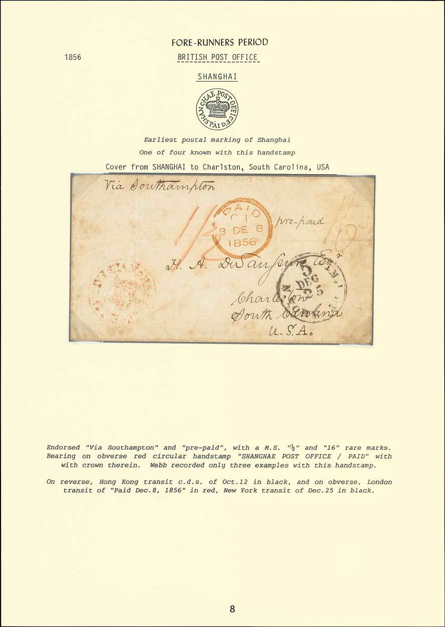 1856 (Oct.) envelope to South Carolina "Via Southampton" bearing a light strike of the first postmark of Shanghai, the large Crowned "shanghai post office/paid" struck in red. The cover bears "1/2" and "16" rate marks with good strike of London Paid (8.12) and New York (25.12) transit c.d.s., the reverse with Hong Kong (12.10) c.d.s. in black. Light creasing and ageing and one of only three such covers recorded as posted to U.S.A.