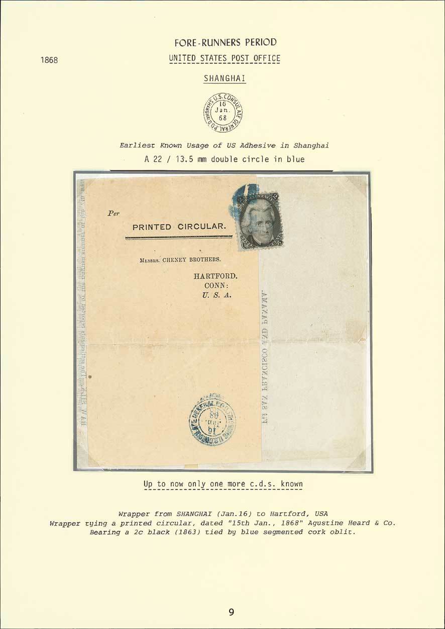 1868 (16 Jan.) Augustine Heard Printed Circular to Connecticut bearing 1862-66 2c. black tied by the rare segmented cork cancellation in blue and showing a good strike of the very rare "u.s. consulate general p.o.d./shanghai" c.d.s. also in blue. Only two examples of this postmark have been recorded, both used on the same date.