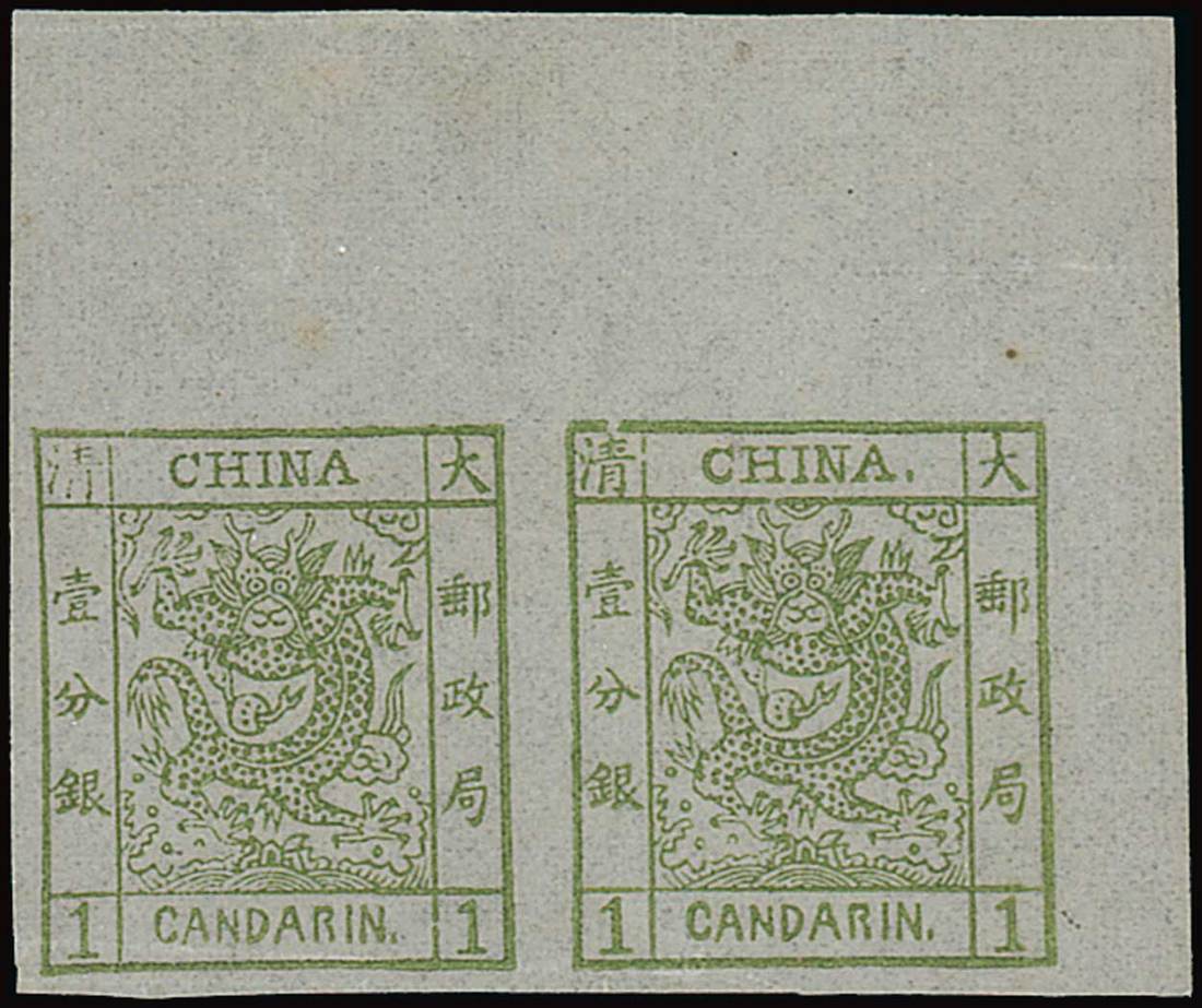 1ca. coloured plate proof in light yellow-green on thin paper, an upper right corner pair [4-5] on ungummed paper. Fresh and fine