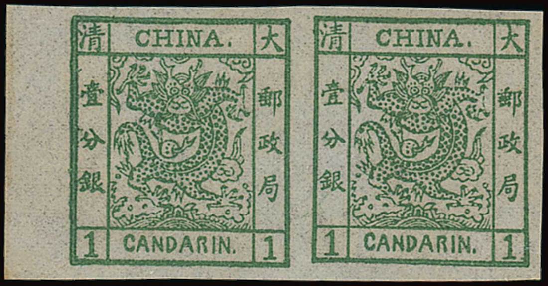 1ca. deep green, [6-7] horizontal pair from Setting I with left margin, good margins and large part original gum. Fresh and fine