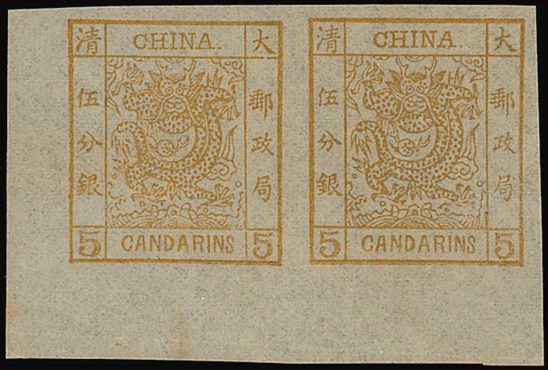 5ca. orange-yellow, [21-22] lower left corner pair from the first setting; without gum; large margins and trivial paper wrinkle. Fine
