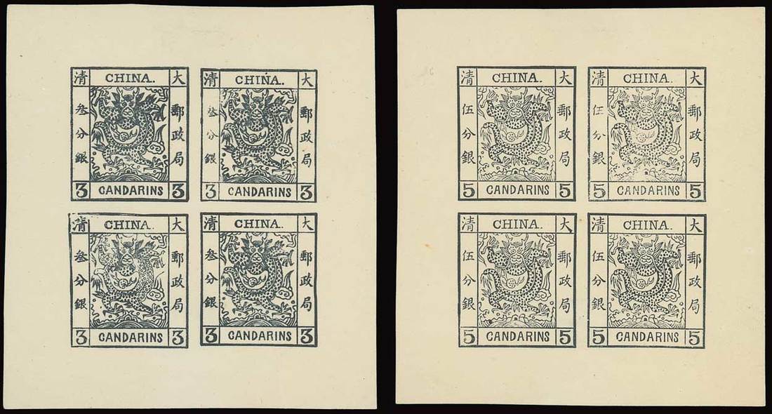 Mr Juan Mencarini was a member of the Statistical Department of the Customs Office in Shangahai. He discovered, in a department safe, some clichés which he made into the three blocks of four stamps and was given permission to make some impressions. He printed three sheets of each value. Only two sets of complete sheets are known, the other set was included in the Starr collection, and there must be four sets of singles.
