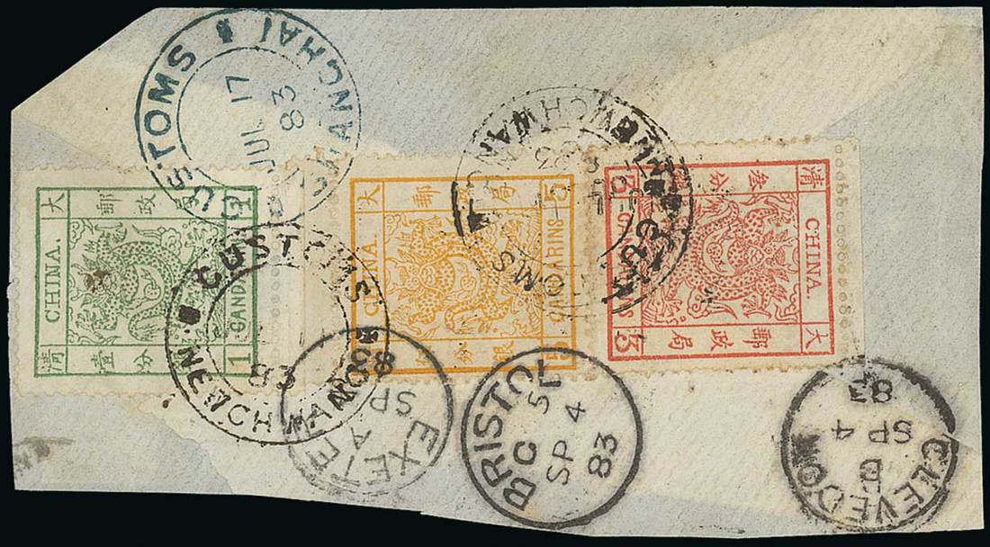 1883 (11 July) large piece from the reverse of a cover bearing 1ca. light green [18], 3ca. pale brown-red [23] and 5ca. yellow-ochre [12] tied by good strikes of the "customs/newchwang" c.d.s., Customs Shanghai (17.7), Exeter, Bristol and Cleveland (4.9) British c.d.s. A rare combination of the large setting