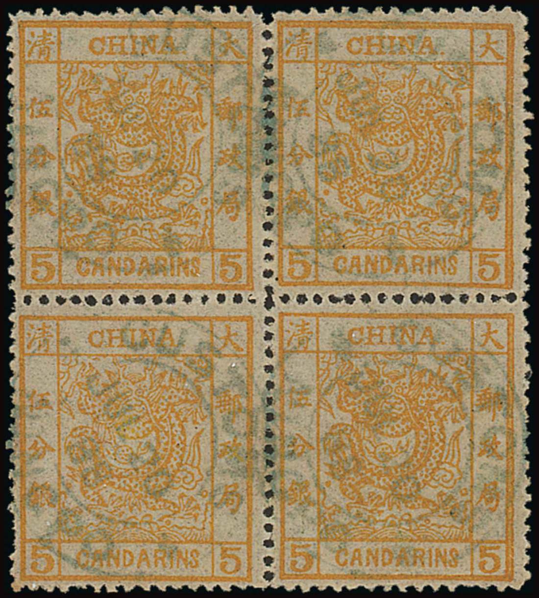 5ca. orange-yellow block of four [13-6/15-14] from Setting II, each cancelled by a central strike of "customs/ningpo" 1888 (20 July) c.d.s. in light blue; a couple of short perfs. but still with much gum on the reverse. Attractive