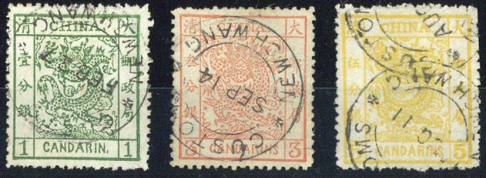 Newchwang: Thick paper 1ca. bright green, 3ca. pale red and 5ca. chrome-yellow [18] cancelled by fine and central strikes of "customs/newchwang" c.d.s. without yeardate (1885-87); fair to fine. (3)
