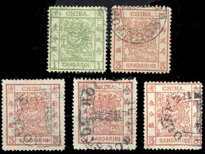 Wuhu: A group bearing double-oval "customs-house/wuhu" in black with thin paper 1ca. pale green [11] and 3ca. brown-red; wide setting 3ca. (2) and thick paper 3ca. ; the 1ca. with unusual offset of left margin on the reverse. One wide setting with perf. faults at top; fair to fine. (5)
