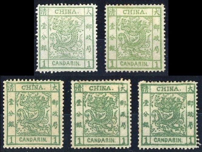 A range of shades with pale green, yellow-green, green and deep green (2), displaying different intensiy of inks; traces of gum to part original gum, a couple of tone spots. (5)