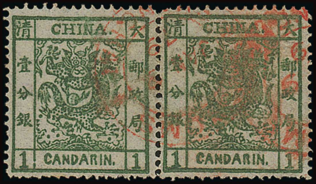 Deep green [8-9] cancelled by readable strikes of "customs/shanghai" 1879 (9 Jan.). Fine and an early date