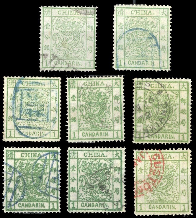 A group of shades with pale green [19] and [9], yellow-green (2) with Customs c.d.s. one with1879 Chinkiang, green, bright green [11] and deep green (2) one with faint Newchwang Customs c.d.s. Good to fine. An interesting group which demonstrates how the different ink mixes were absorbed into the paper. (8)