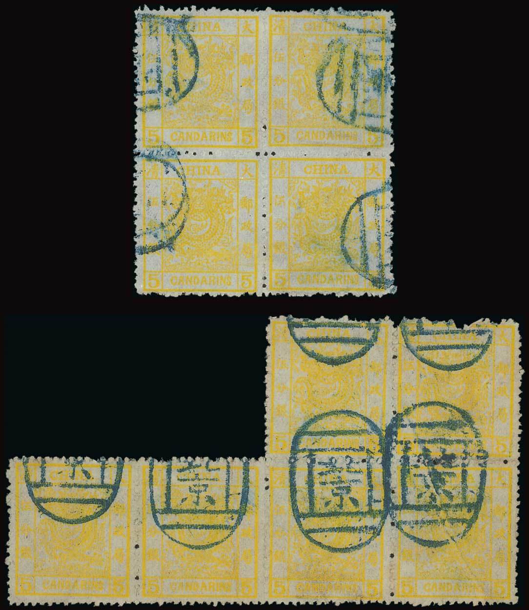 A 'reconstruction' of this setting which includes the rough perforation block of four [17-7/10-22] and the irregular block of six [15-9/19-2-21-14] cancelled by Peking seals in blue. The block of four is in a pale lemon shade, is fine and signed by Holcombe; the block of six in in chrome-yellow, there are a few perf. faults at top, otherwise fine. The single stamps have not been correctly identified and include one very fine stamp cancelled by part "i.g. of customs/peking" c.d.s.
