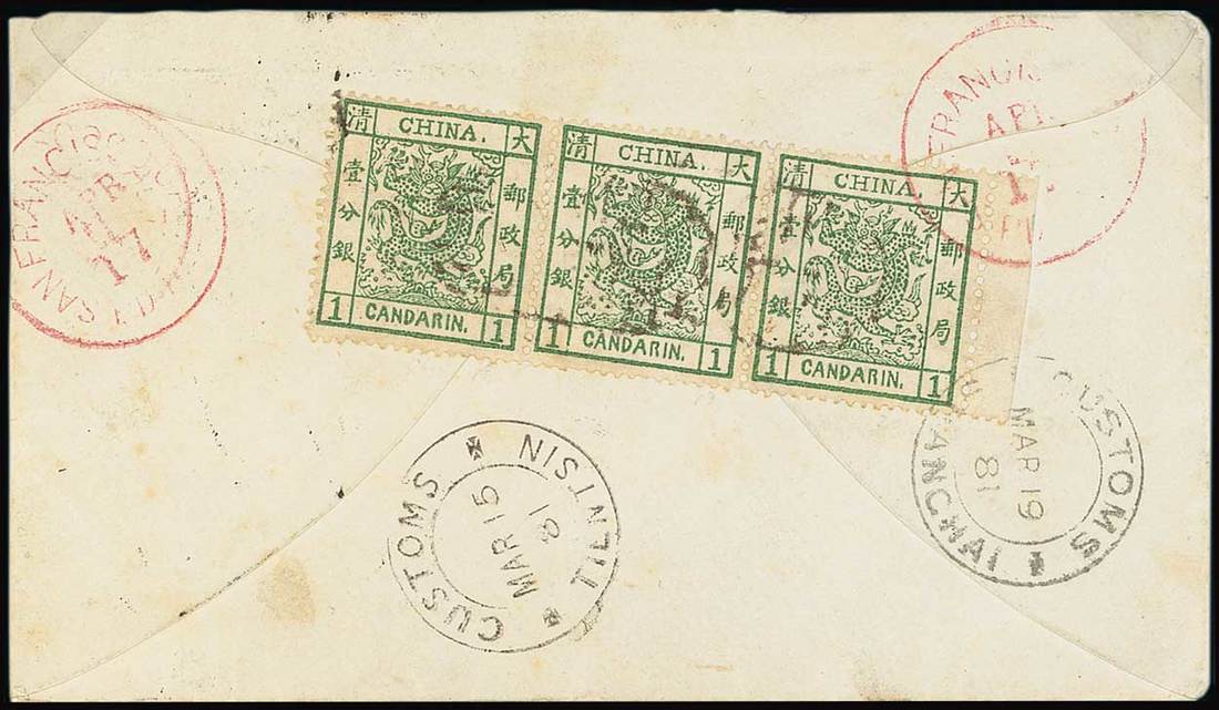 1881 (15 Mar.) opened-out envelope from the United States Consulate in Tientsin to North Carolina bearing, on the reverse, 1ca. green strip of three [18-19-20] with right margin cancelled by a light strike of Tientsin type B seal in black with the Customs despatch c.d.s. alongside, tied by Shanghai Customs c.d.s. (19.3) and San Francisco transit (17.4), the address side with U.S. 1875 5c. Taylor tied by cork obliterator with "u.s.postal agency/shanghai" type IIa c.d.s. alongside. The envelope has been marked "Immediate". Fine and attractive.