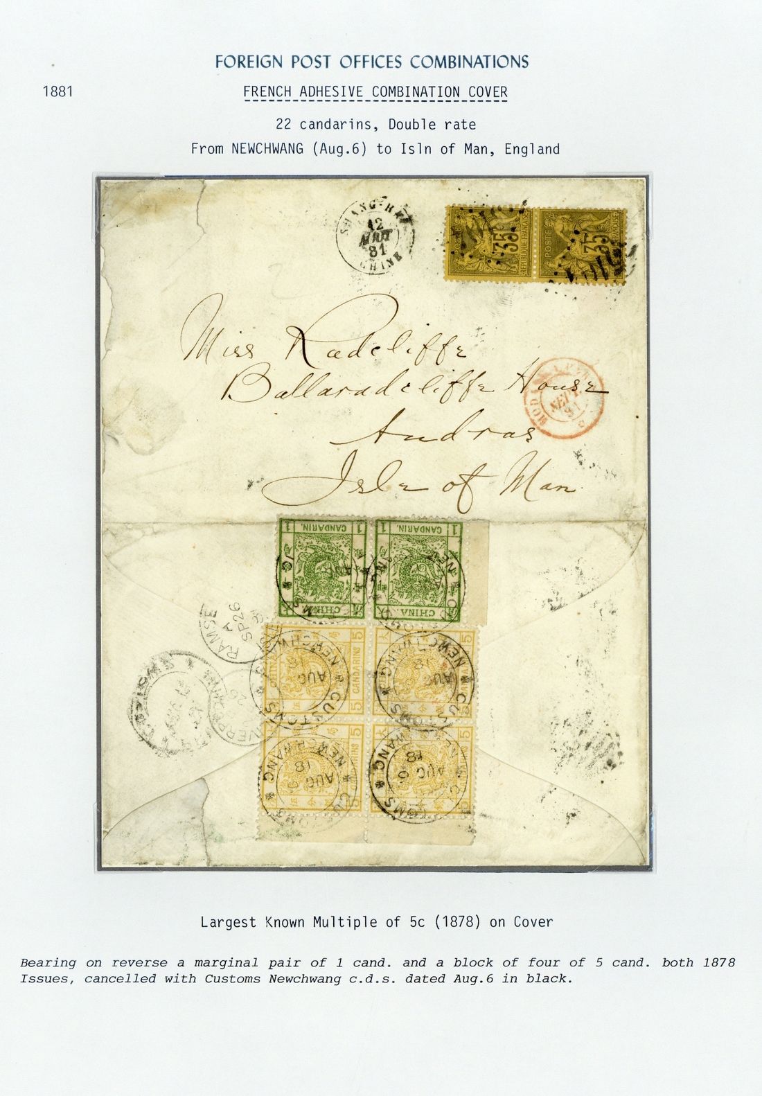 1881 (6 Aug.) opened-out envelope to the Isle of Man bearing, on the reverse, 1c. yellow-green pair [11-12] with left margin and 5ca. light orange-yellow block of four [16-24/22-23] with left margin from Setting II tied by Customs Newchwang c.d.s. (yeardate inverted); the address side bearing France 35c. pair tied by "5104" gross chiffres obliterator with "shang-hai/chine" c.d.s. (12.8) alongside with "mod a paris" c.d.s. in red. The reverse with Shanghai Customs, Liverpool (26.9) and Ramsey c.d.s. The lower tip of the 1ca. stamps overlap the edge of the envelope and there is some typical light soiling.