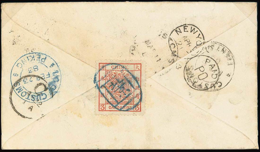 1883 (23 Feb.) opened-out envelope to New York "Via Japan" bearing, on the reverse, wide margin 3ca. red [13] tied by blue Peking seal with the despatch c.d.s. alongside, faint Tientsin (6.3) and Shanghai (11.3) with New York arrival duplex (21.4); the address side with Japan Koban 5s. brown cancelled by cork crossroads obliterator with "i.j.postal agency/shanghai" (14.3) and Yokohama thimble (22.3) c.d.s.