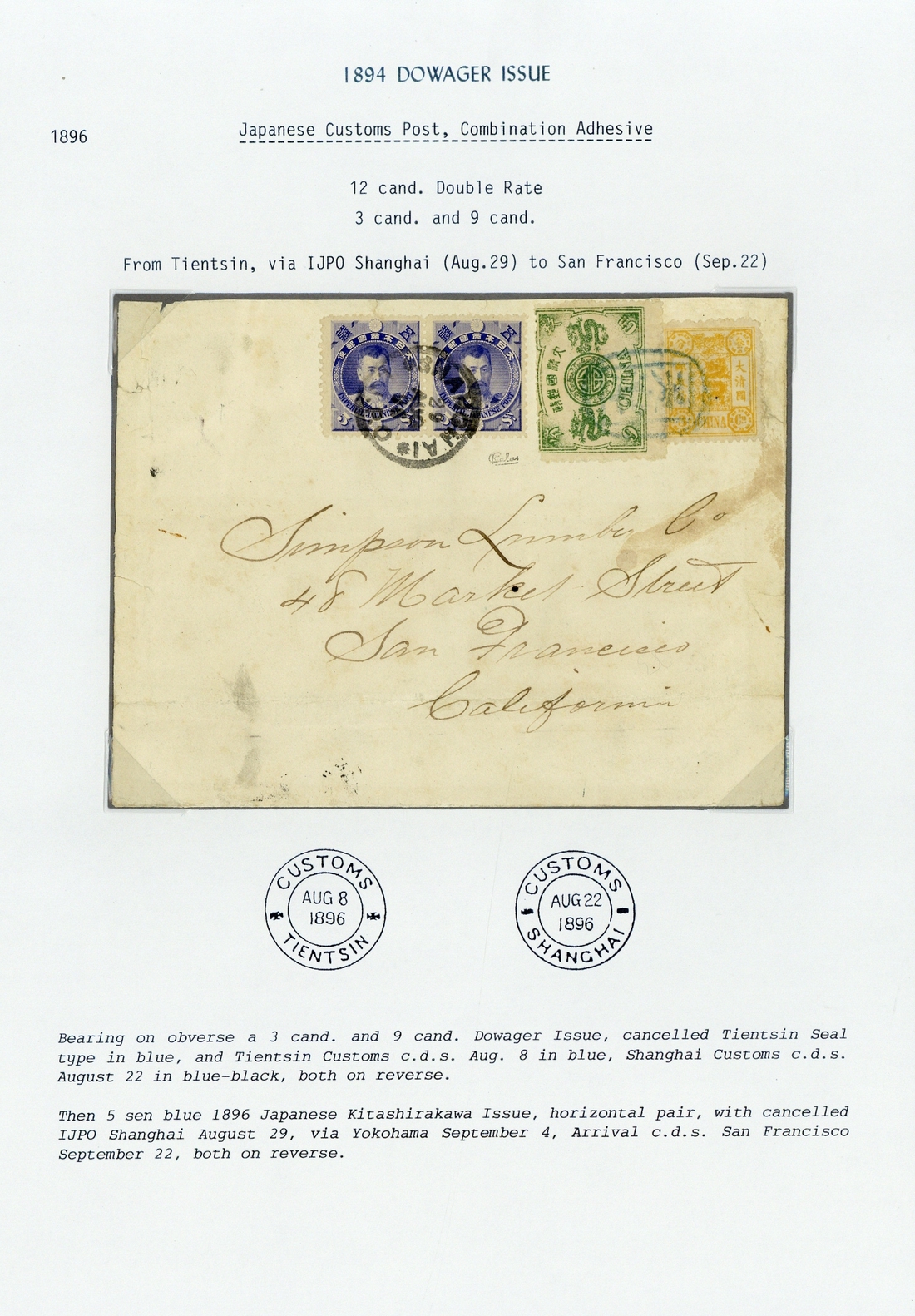 1896 (6 Aug.) commercial envelope to San Francisco bearing 3ca. orange-yellow and 9ca. bright green cancelled by Tientsin seal in blue with pair of Japan 1894 Emperor's Silver Wedding 5s. ultramarine tied by "shanghai/i.j.p.o." c.d.s., the reverse with Customs Tientsin and Shanghai (22.8) c.d.s., Yokohama (4.9) and San Francisco arrival (22.9) c.d.s. Some light soiling and corner imperfections it top left.