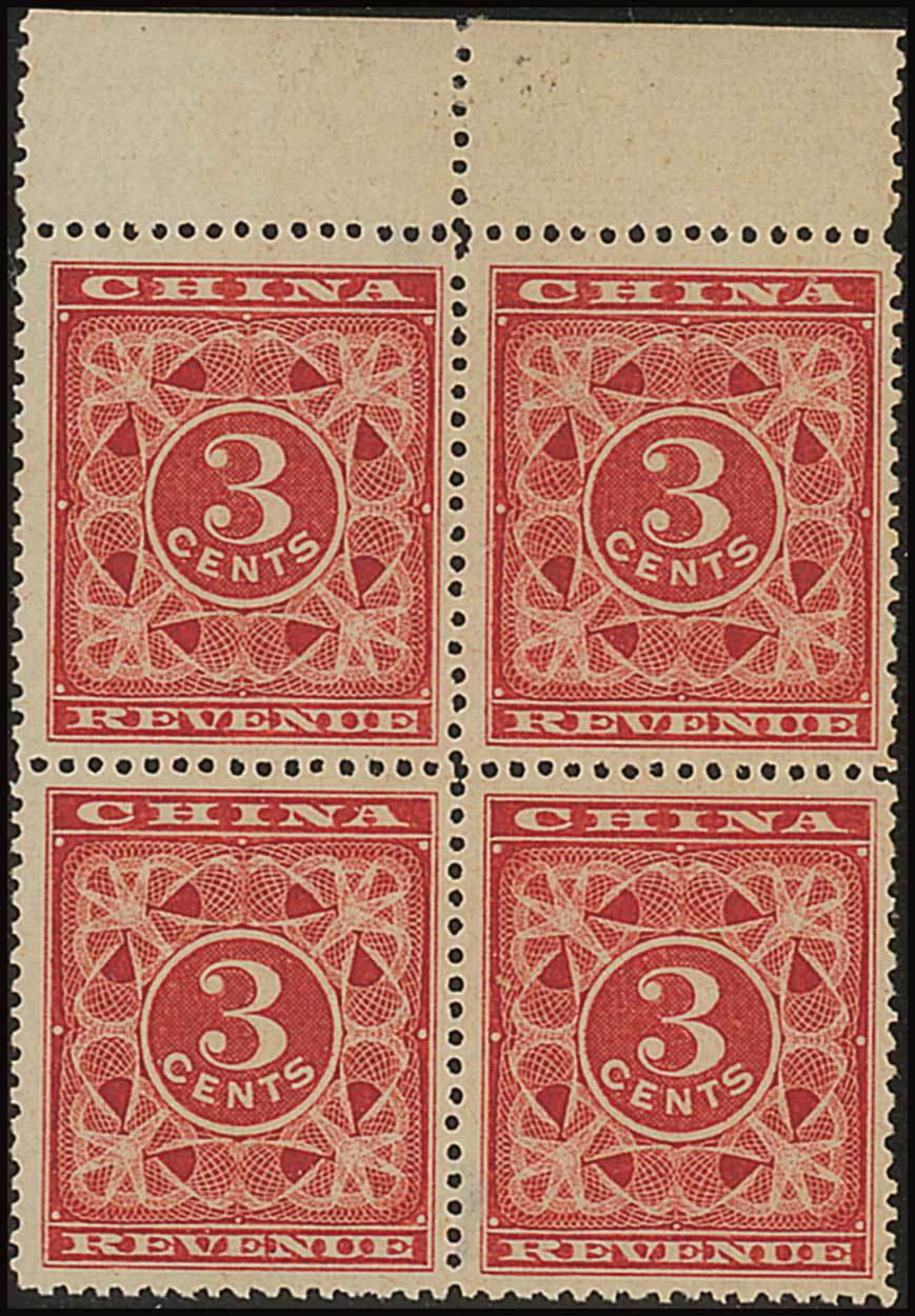 3c. red in a top margin block of four [7-8/17-18], lightly mounted with full original gum; there are a couple of small thin spots where old hinges have been removed which are confined to [7] and [18]. A beautiful and fresh block in a very rich colour and a worthy addition to any collection or exhibit