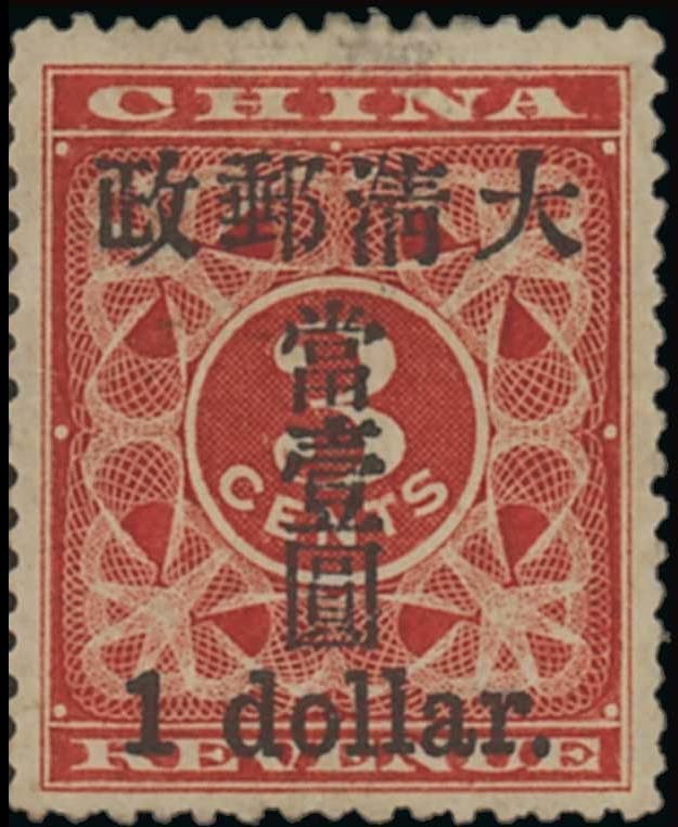 $1 on 3c. red [2] part to large part original gum with part hinge remainders at top. Fresh, bright colour on white paper; there is small patch at the top of the stamp which shows slightly greater transparency. It is difficult to tell whether this is a slight thinning of the paper or a small area where oil from the hinges has affected the paper. This does not detract from its magnificent appearance. A very good example of this legendary rarity.