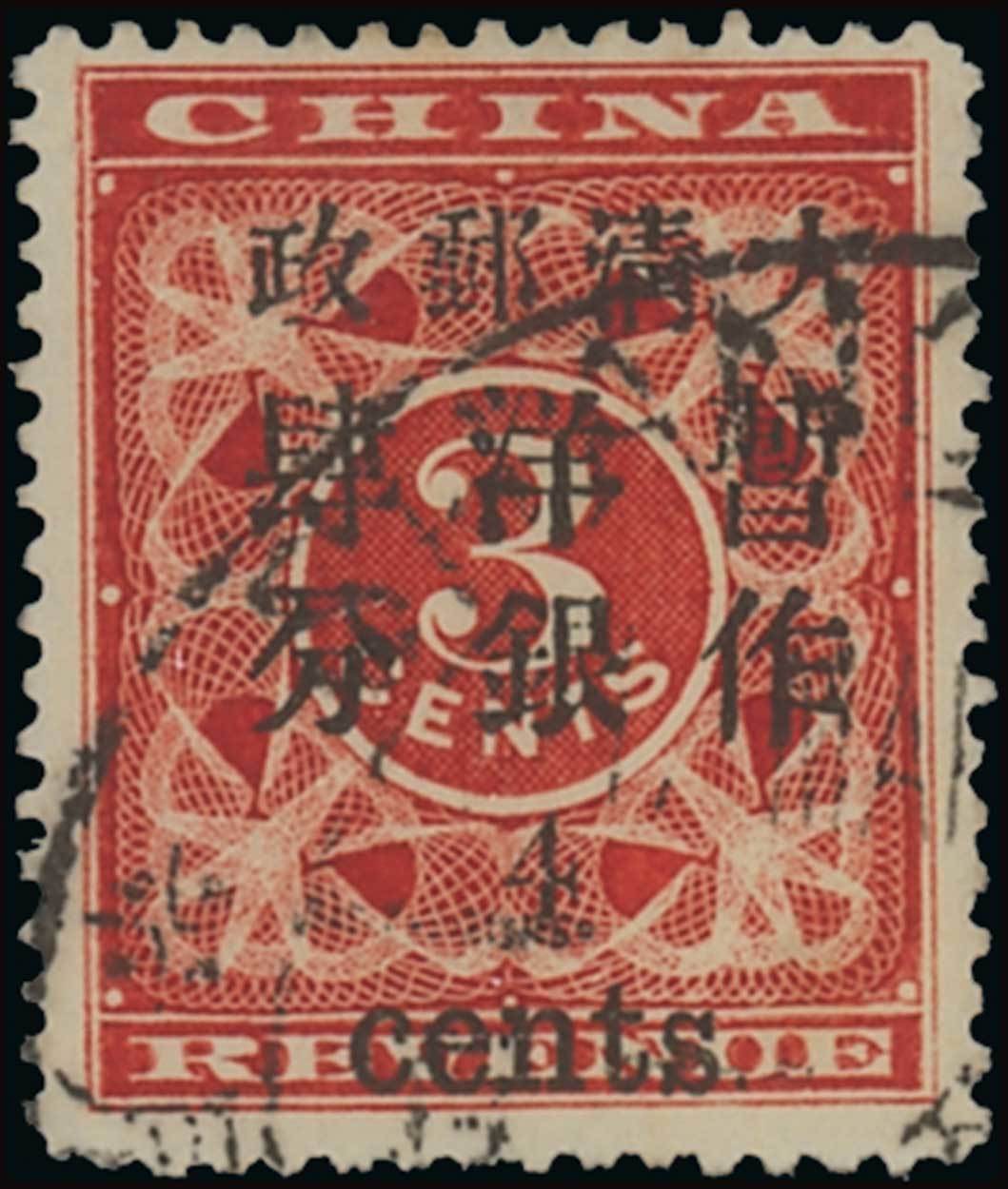 Small 4c. on 3c. red [18] from pane l (the used pane) with part Shanghai Dollar chop dated 1898 (17 Mar.); bright colour and very fine. Rare and desirable used in such fine condition