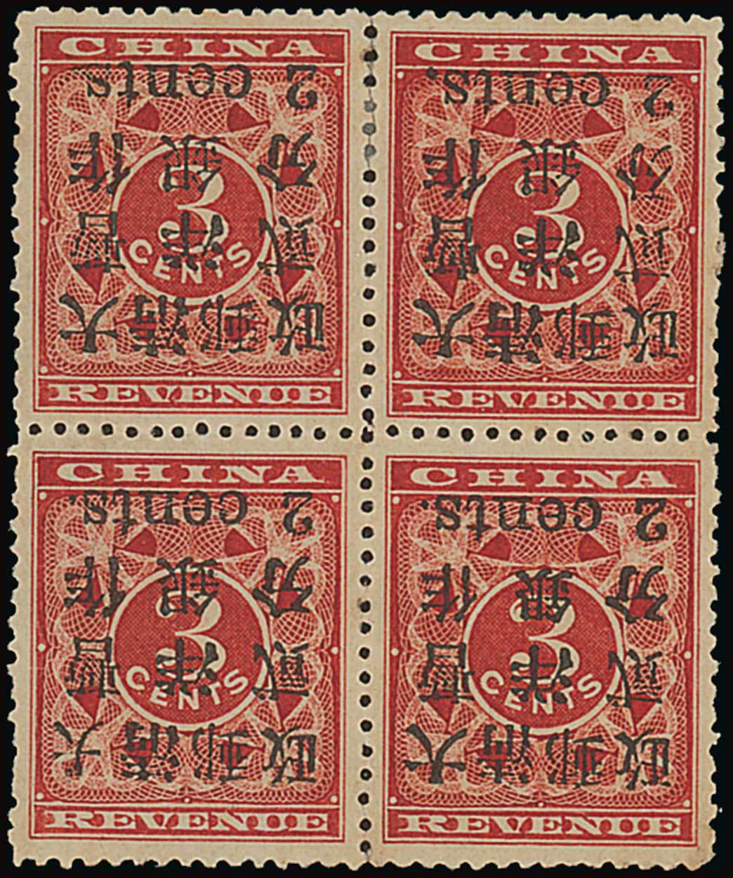 2c. on 3c. red variety surcharge inverted, surcharge [9/20] block of four, part to large part original gum; some adherences on the gum where this block had become stuck to the sheet below and there are a couple of small thins; some hinge remnants also strengthen some split perforations. An exceptionally well centred block with fresh colour and white paper. Only nine blocks of four recorded. S.G. 93a, £192,000; Chan 84i