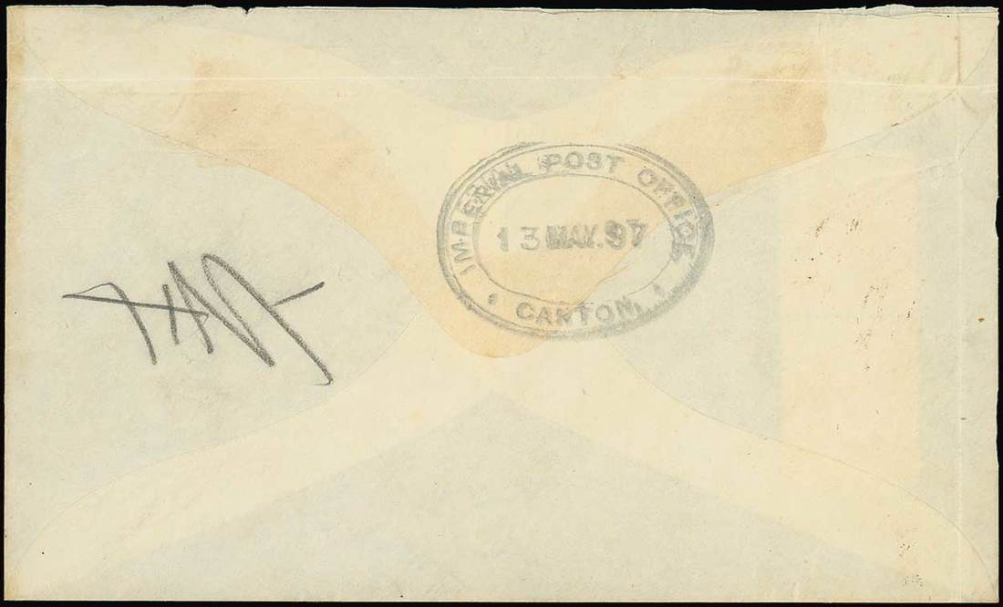 1897 (7 May) envelope to I.M. Customs, Canton bearing vertical pair of Large 2c. on 3c. tied by a good strike of Customs Shanghai c.d.s. and, bearing on the reverse, a good strike of the large double-oval " imperial post office/canton" dated oval (13.5) in bluish and delivery characters. The envelope has a couple of folding creases at the very left and top. Fresh and attractive. The Canton oval datestamp is extremely scarce