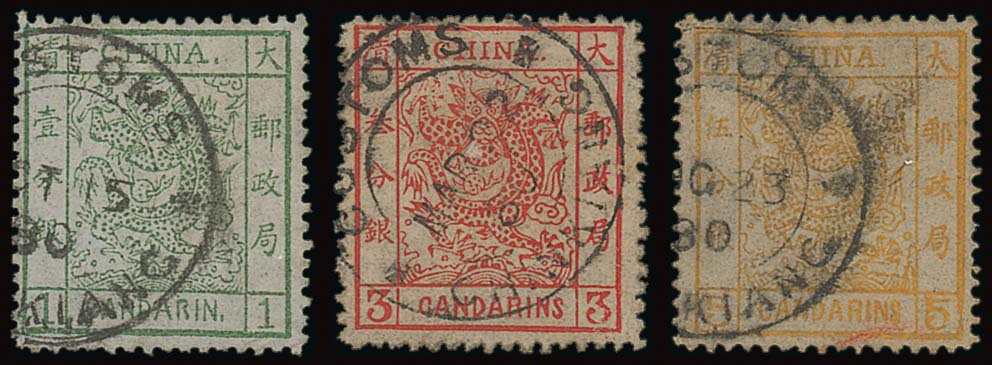 — 1880 dates; 1ca. to 5ca. set of three with 1ca. bright green [23] dated (15 Oct.), 3ca. bright scarlet dated (22 Mar.) and 5ca. dull yellow dated (23 Aug.); good to fine. (3). Photo