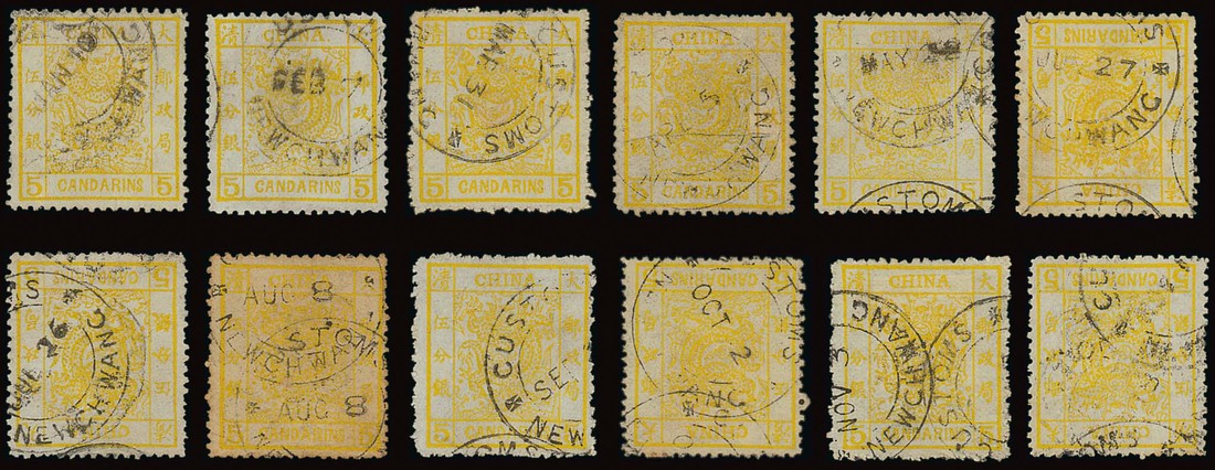 — Without yeardate; 5ca. selection on thicker paper showing a range of shades with most in the distinctive chrome-yellow, each with readable strikes of the c.d.s. representing each month of the year (December is not clear), generally good to fine. (12)